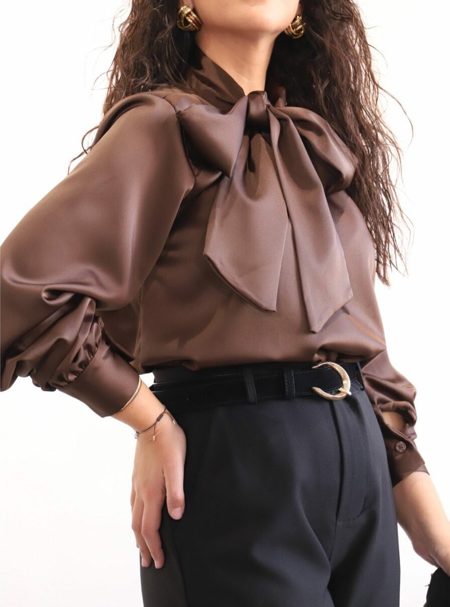 Blusa satinada con dos tiras en el cuello para poder hacer una lazada o nudo. Se ajusta en el puño.