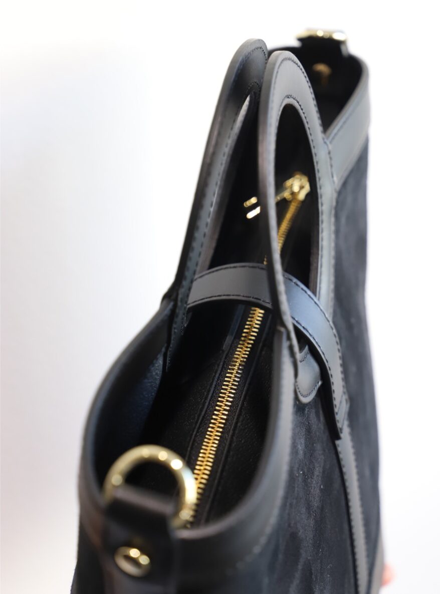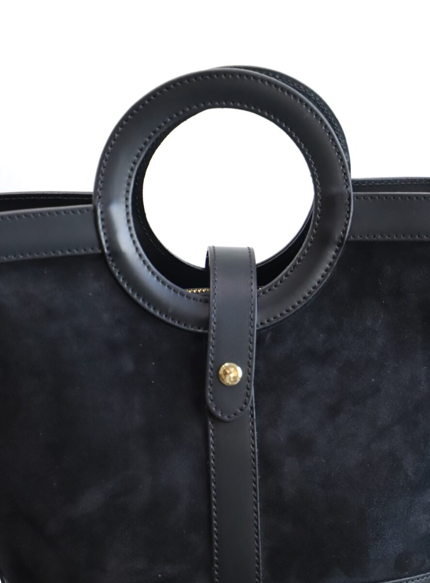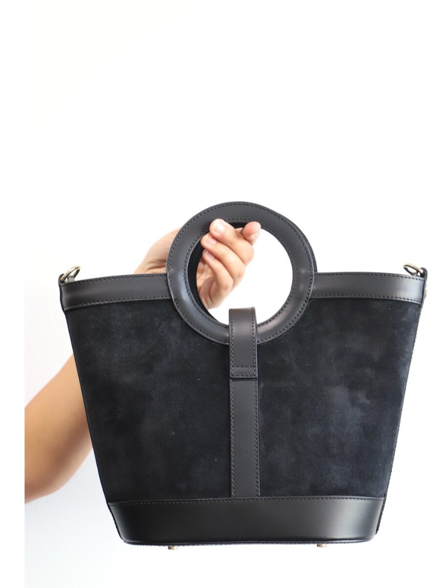 Bolso de piel con el agarre en forma de círculo y con correa de piel para colgar. Tiene detalles de piel y serraje. Tiene broche de corchete y en el interior tiene un bolso con cremallera que se puede quitar o poner.