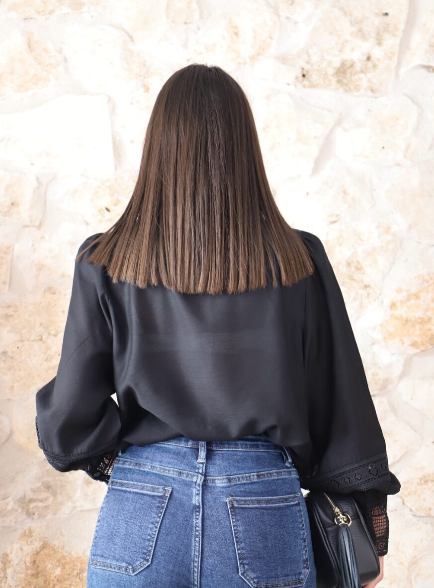 Camisa con cuello solapa y troquelado en la parte delantera, manga y puño.