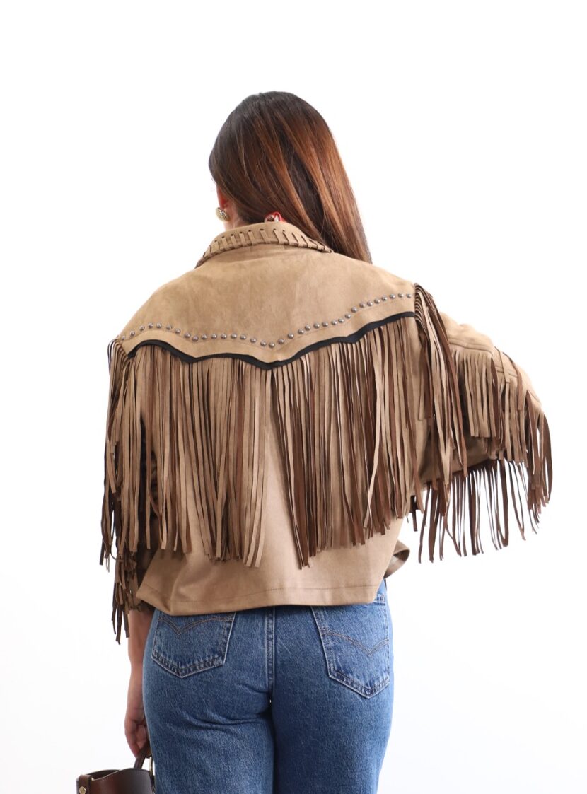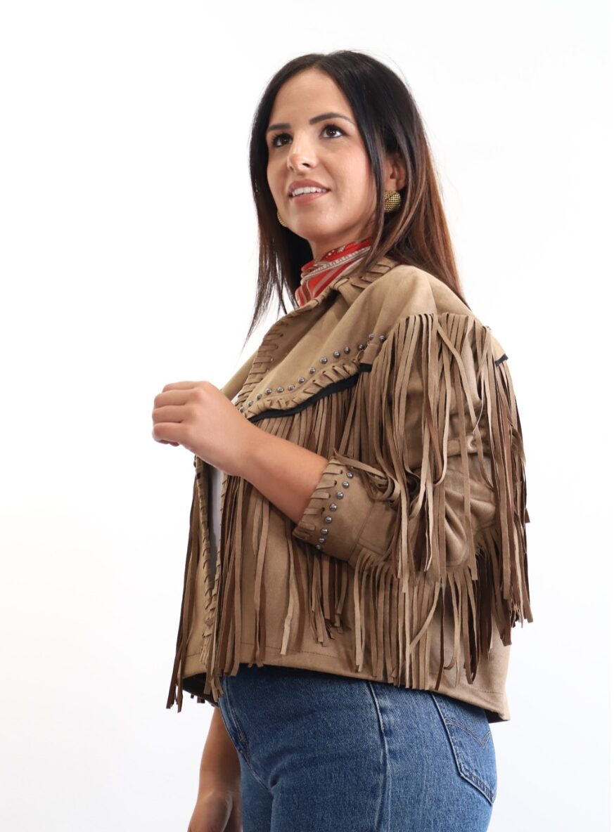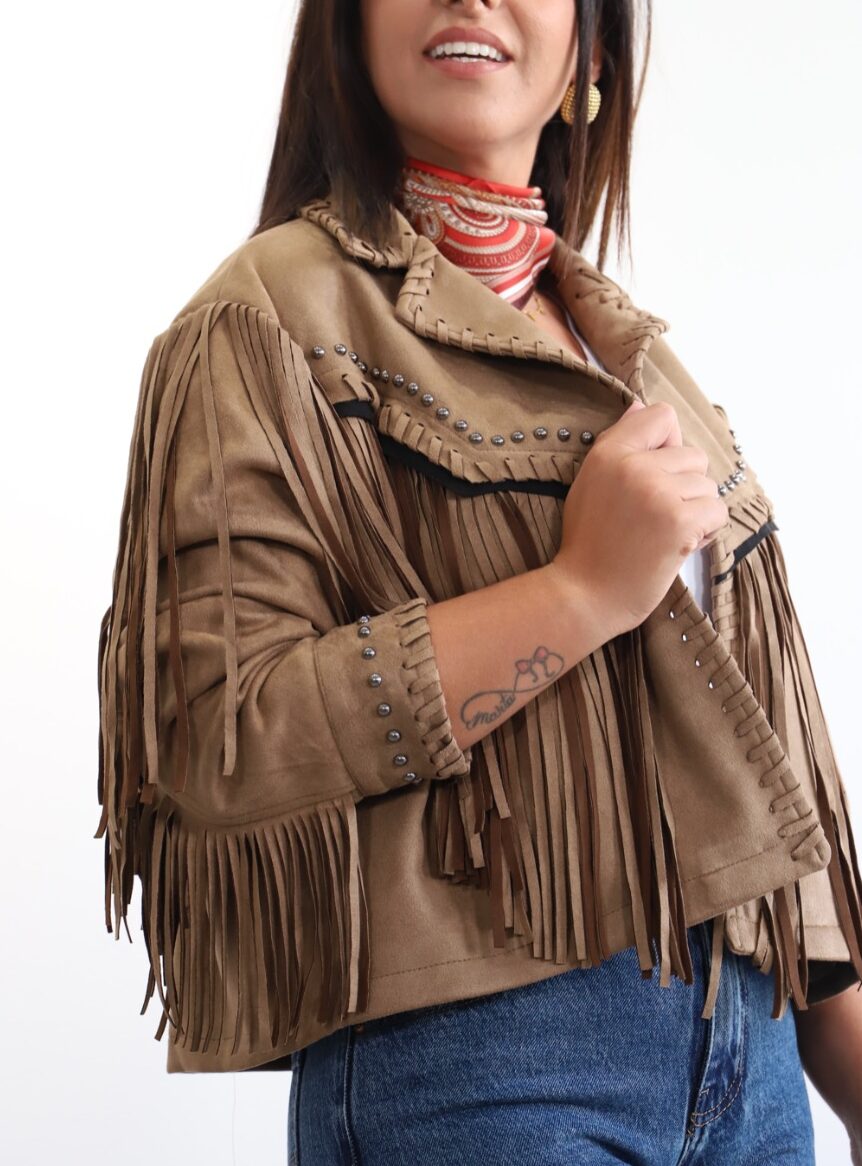 Chaqueta con flecos y tachuelas por toda la parte delantera y trasera. Con el cuello solapa y no lleva ni botones ni corchetes. Tiene detalles de flecos trenzados desde la parte delantera hasta el cuello y mangas.