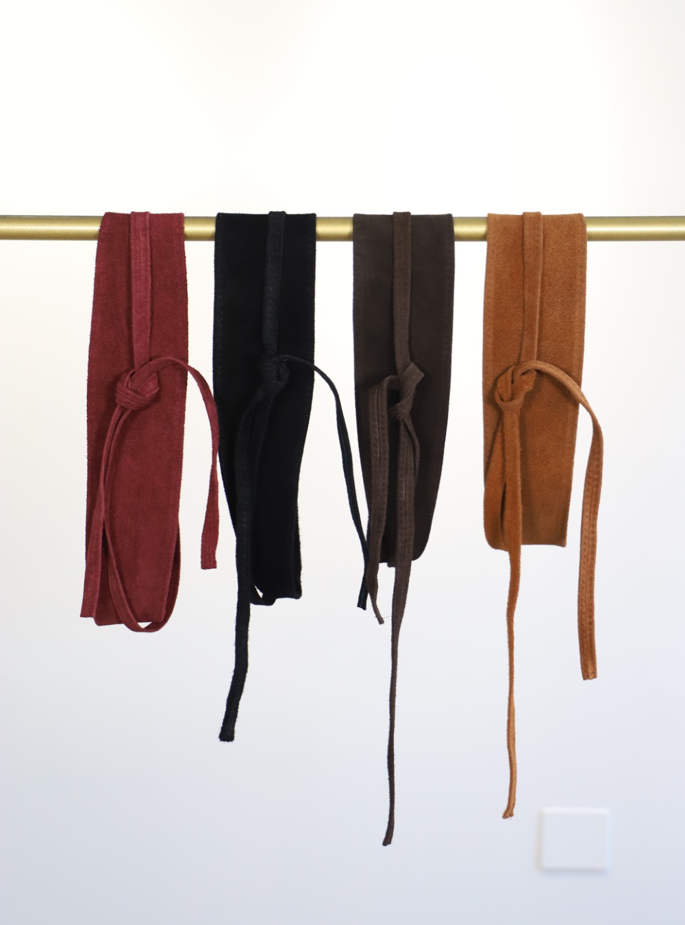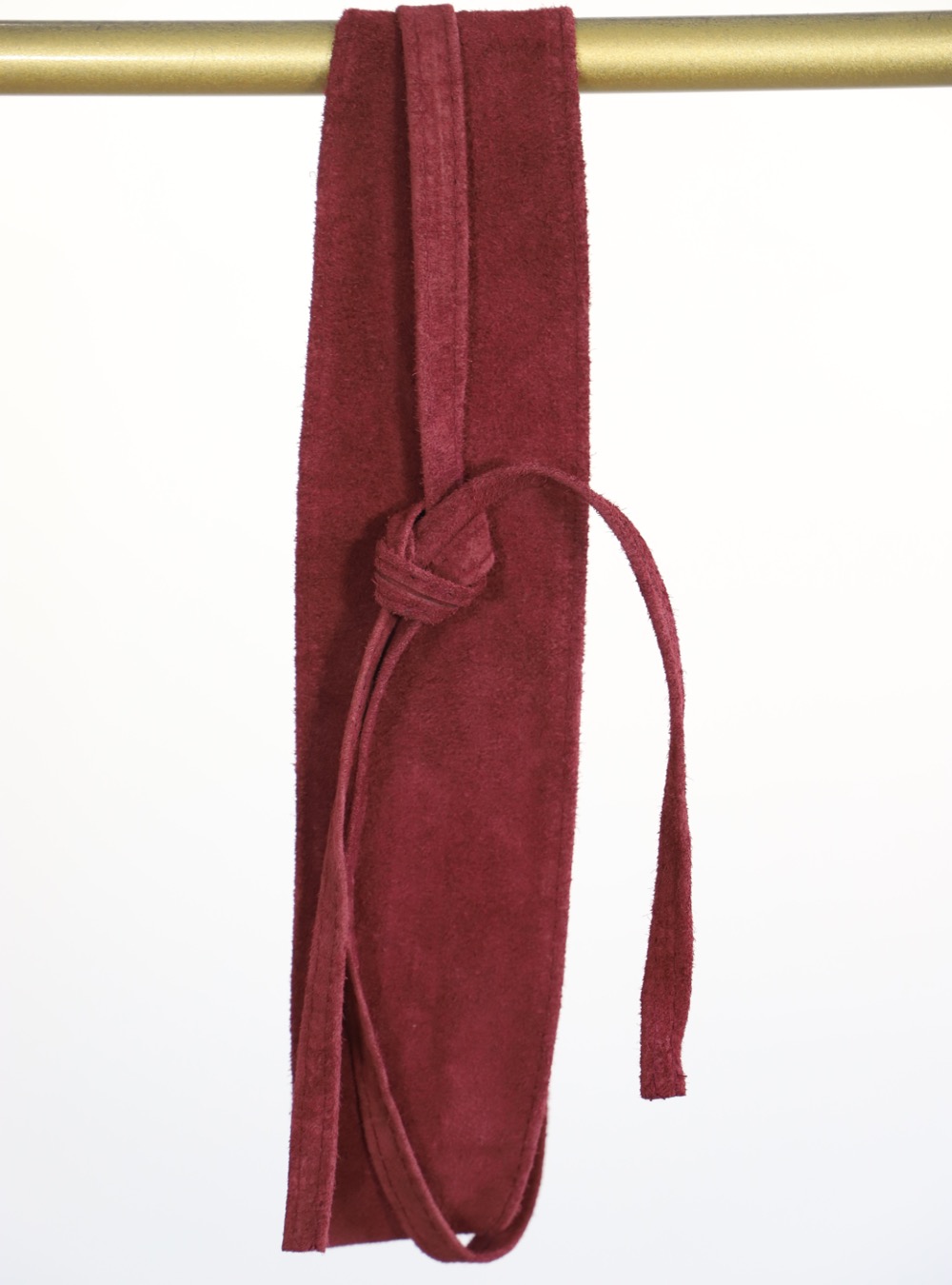 Cinturón de serraje que se ajusta con nudo o lazada. Con un ancho de 8 cm.