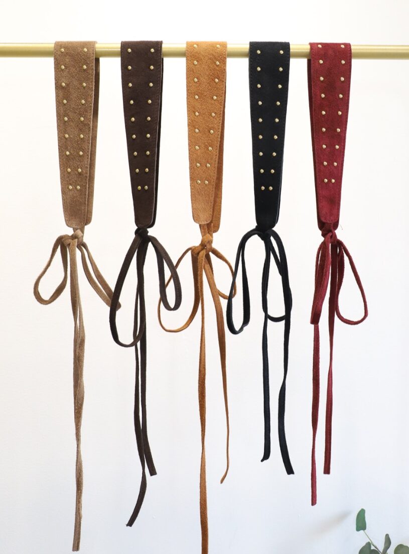 Cinturón de serraje con tachuelas por todo él, que se ajusta con nudo o lazada. Con un ancho de 8 cm.
