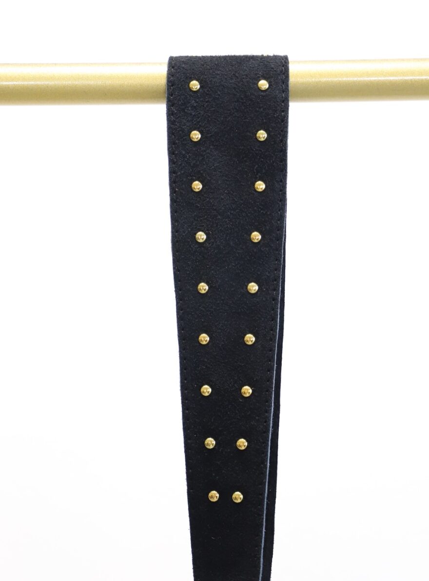 Cinturón de serraje con tachuelas por todo él, que se ajusta con nudo o lazada. Con un ancho de 8 cm.