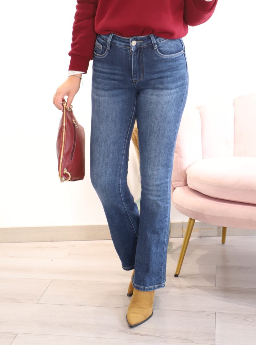 Jeans estilo flare con push up y goma reductora en la cintura.