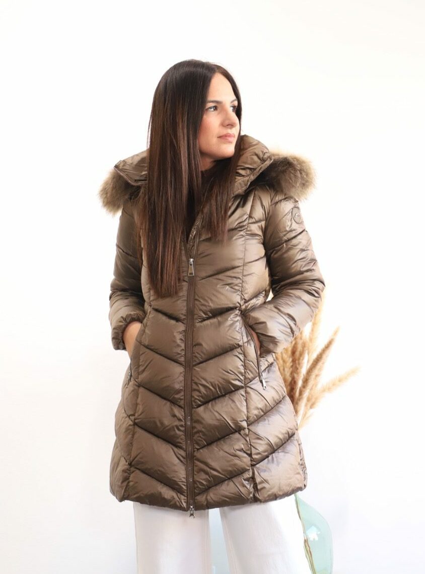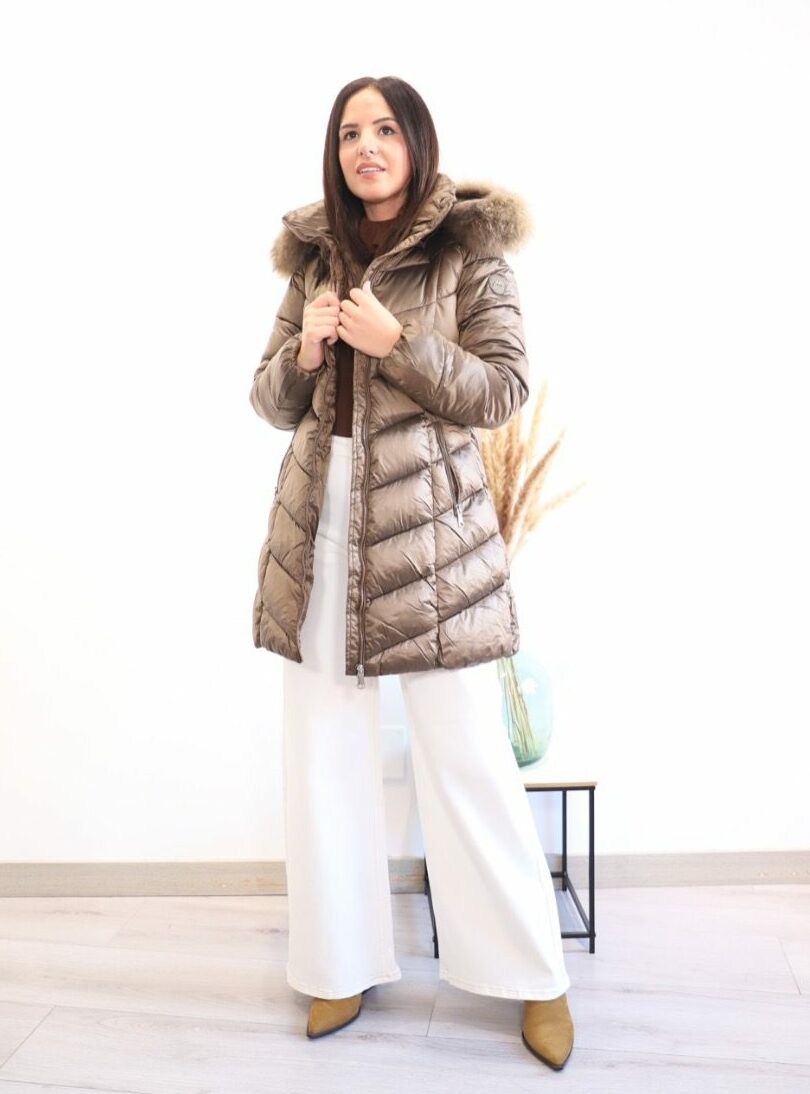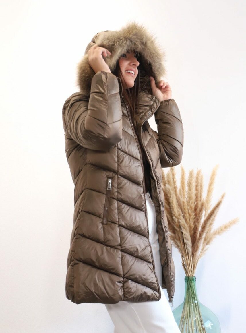 Plumífero acolchado largo con pelo natural en la capucha. Capucha desmontable y corchete para cerrar en los bolsillos.