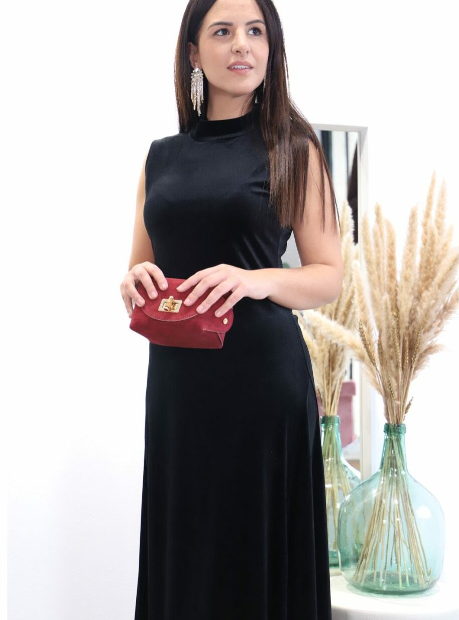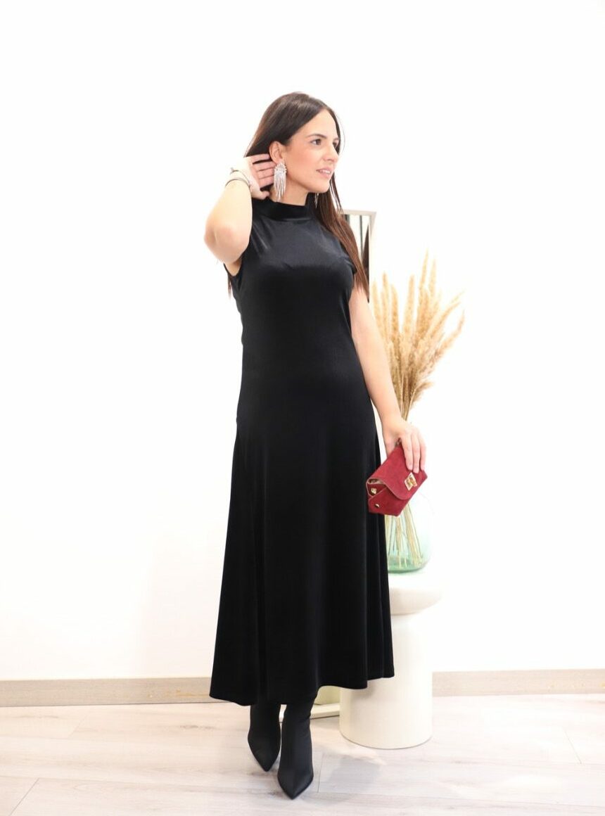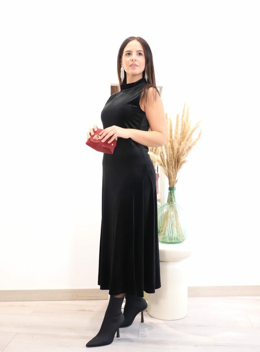 Vestido largo de terciopelo, con efecto evase en la parte de abajo y cuello perkins.
